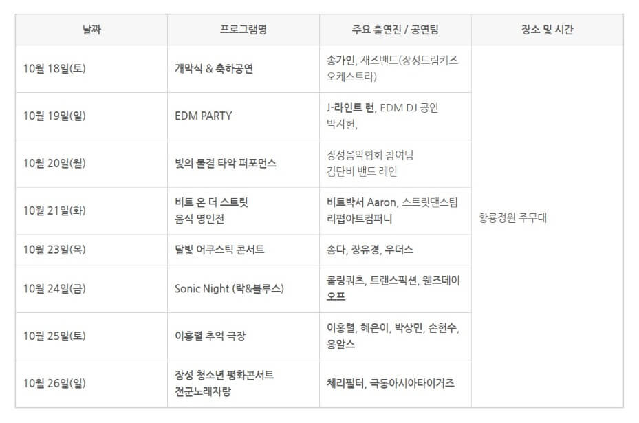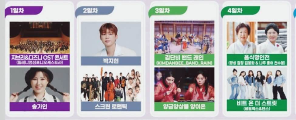 | 10월 18일(토) | 개막식 / 송가인 / 지브리&디즈니 OST 콘서트 |